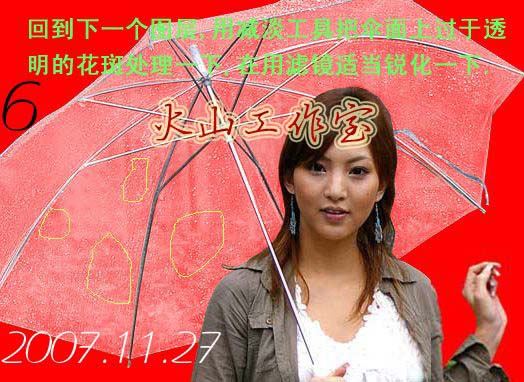 6、回到下一个图层,用减淡工具吧伞面上过于透明的花瓣处理一下,再用滤镜适当锐化一下。