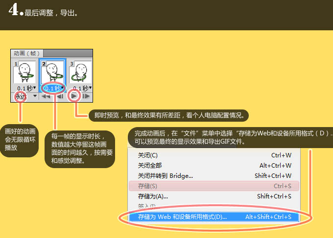 8、最后调整,导出动画。完成动画后,在“文件”菜单中选择“存储为Web和设备所有格式”,可以预览最终效果的显示效果和导出GIF格式。