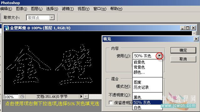 6、点击使用项右侧下拉选项,选择50%灰色填充。