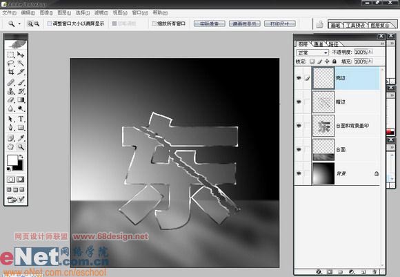 十三、用橡皮檫工具,在亮边层上不断轻擦,以露出后面的暗边,模仿出玻璃边复杂的光感。