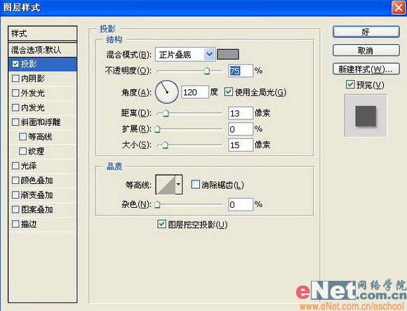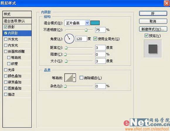 “内阴影”图层样式,设置参数如图12: