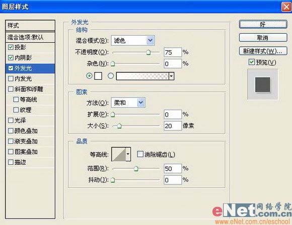 “外发光”图层样式,设置参数如图13:
