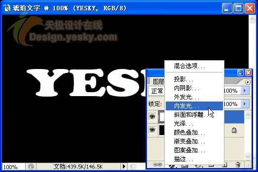 4.单击图层调板下方的“添加图层样式”按钮,然后在弹出菜单中选择“内发光”,如图3所示。