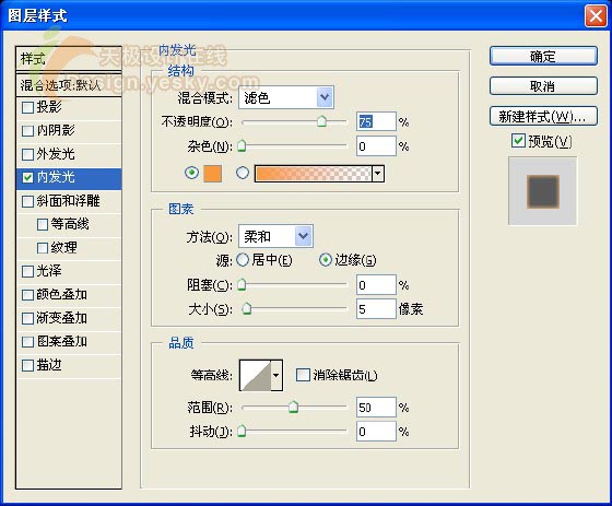5.在“图层样式”对话框中按如图4所示设置“内发光”样式的各选项。