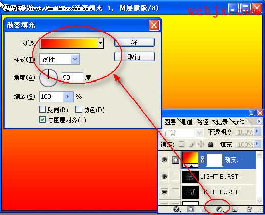 10、最后我们再给发的光上色就可以了。怎么做呢?当然是添加一个渐变调整层,设置渐变颜色由红色到黄色。
