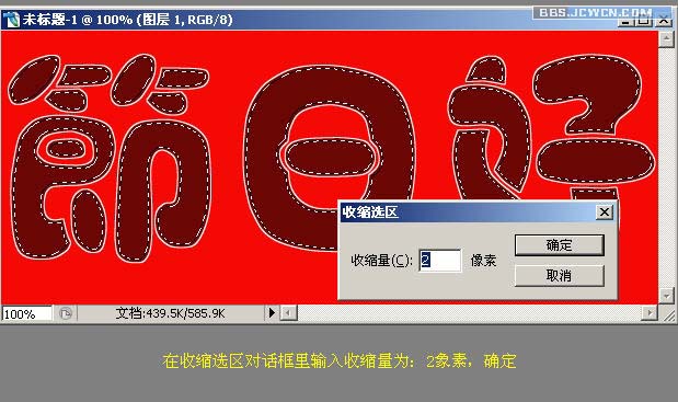 7、在收缩选区对话框里输入收缩量为:2像素,确定。