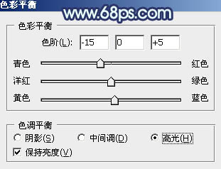 5、创建色彩平衡调整图层,对阴影,高光进行调整,参数设置如图18,19,效果如图20。这一步主要给图片高光部分增加淡蓝色。