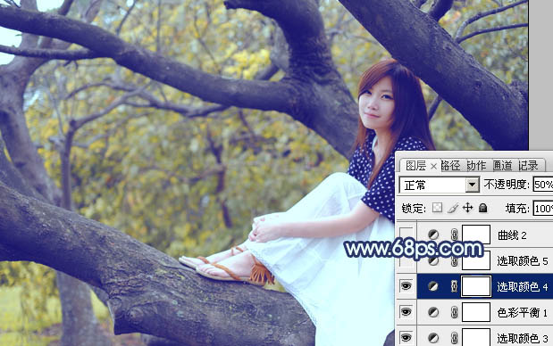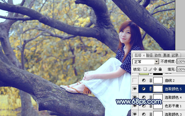 Photoshop制作坐树枝上的蓝黄色小清新美女照片