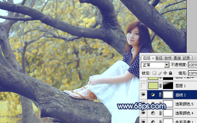 Photoshop制作坐树枝上的蓝黄色小清新美女照片