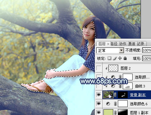 Photoshop制作坐树枝上的蓝黄色小清新美女照片