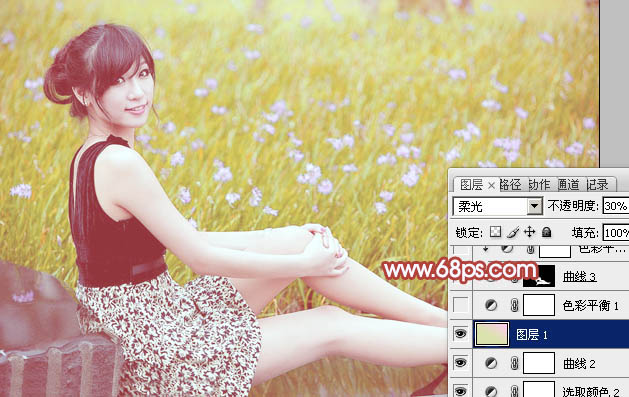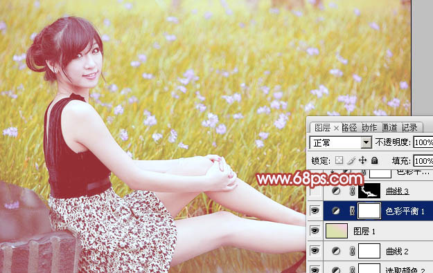 Photoshop调色调出小清新粉黄色的草地上美女照片