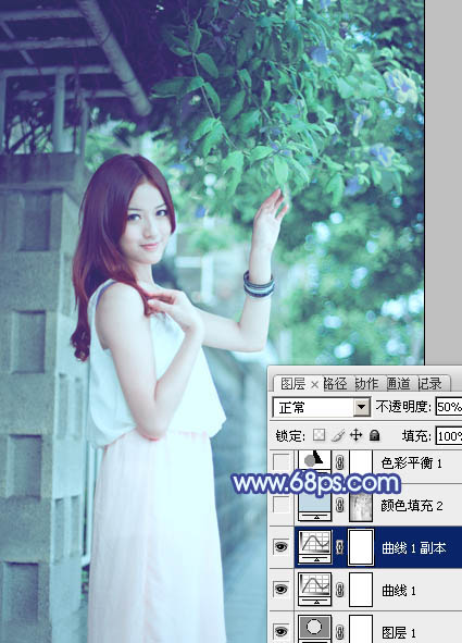 Photoshop打造柔美冷调青蓝色外景美女照片调色教程