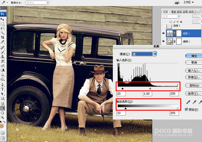 16、执行调整图层-色阶-通道-蓝,适当调整画面的色彩。