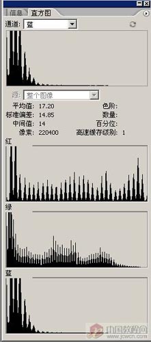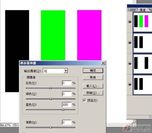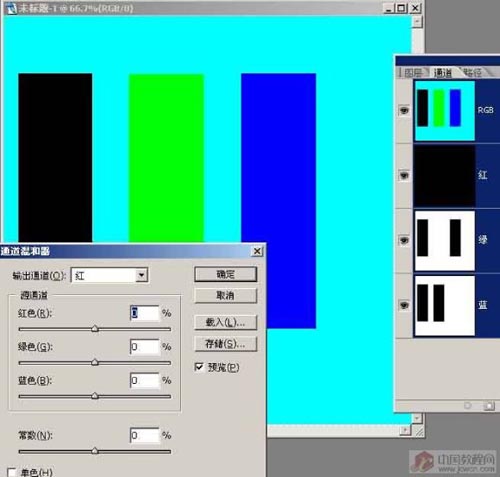 不胡侃了,进入正题了。我们首先将红色从100%调到0%。why?图怎么一下子变成青色的了?再看看通道调板,红色通道变成了一个黑通道!这是为什么?我想很多朋友已经猜到了,那我来解释一下:首先因为你所选的输出通道为红色,调整这个通道时并不影响其他通道,在通道调板中可以看出来。其次将红色调为0%表示在红色通道中将不显示白色,可以观察红色的通道调板,全黑。(题外话:在RGB的各个通道中显示为白色的表示该该通道该成分多,黑色表示少,灰色就没准了--!) 最后,青色和红色是对势不两立的颜色,红色强青色就弱,青色强红色就弱。因为将红色变为了0%,所以青色胜利了。