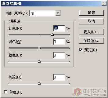 下面打开通道混合器,也许很多人会奇怪,什么是输出通道是什么,原通道又是什么?输出通道就是你要修改的通道,源通道可以理解为向你要修改的通道(输出通道)中添入的另外两个通道的成分。也许现在不明白,没关系,下面就会明白了。也许你还奇怪为什么源通道中的红色为什么是100%,这个问题关系到RGB原理构成,我就不跑题了。