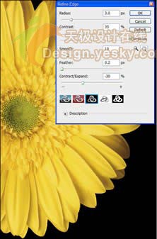 在选项栏中我们可以看到有一个“Refine Edge”(优化边缘)按钮,单击该按钮会打开一个对话框,在对话框中可以所做的选区做精细调整,可以控制选区的半径(Radius)和对比度(Contrast),可以羽化(Feather)选区,也可以通过调节光滑度(Smooth)来去除锯齿状边缘,同时并不会使选区边缘变模糊,以及以较小的数值增大或减小选区大小。