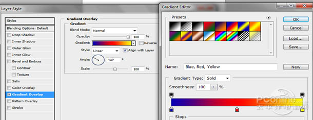 30、如文字印刷图层的做法,刚才用大直径笔刷绘画的文字也同样添加渐变叠加,颜色可以选择蓝、红、黄,渐变角度调整为147°。设置如下图所示。最后,可以考虑再添加其他的元素,这里添加了一些细微的光线来增加背景的丰富度。你也可以增加自己想要设计的元素。