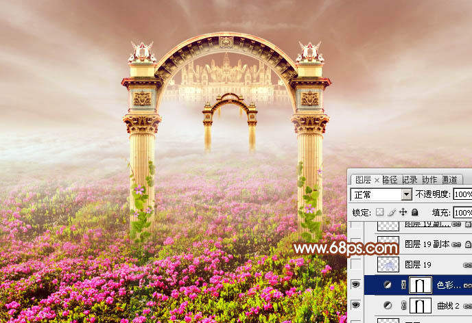 24、创建曲线调整图层,参数设置如图,确定后用黑色画笔把拱门擦出来,效果如图。