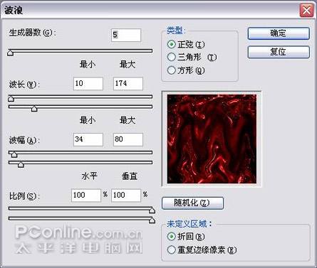 6. 复制两层分别起名为 1和2 方便后面制作的时候解释的清楚。把1的属性栏里设置为变亮,2的设为滤色。(最上层)激活图层1,点滤镜—扭曲—波浪设置如下。(不一定和我的要一样,随机不同,花纹也不同)(图7)