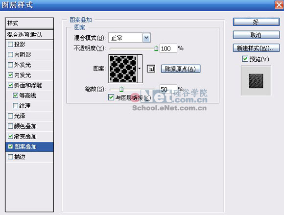 这个定义的图案怎么加入到以后的图案叠加的样式中去呢?首先在PS中打开我定义好的这个图象然后选择编辑-定义图案,在关掉这个打开的图象就OK了。这个图案就会自动的加入到PS中的图案叠加样式中的预设图案里。