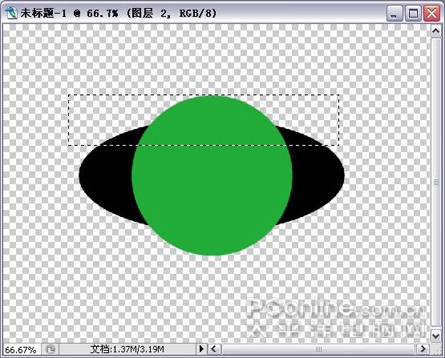 1. 新建一个800*600 的透明文件,在图层面板上新建两个图层,在不同图层上分别画个椭圆,填充黑色。用绿色画笔点个表盘大小的圆,在椭圆上画矩形选区。(两个颜色可任意,要的是最后的选区)(图2)