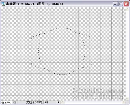 2. 在椭圆的图层上用矩形选框工具画出选区,把选区外的椭圆擦掉,点视图—显示--网格,用矩形选取左右两边的尖角擦掉。(图3)