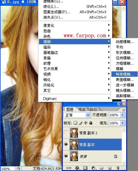 3、在背景副本图层中,选择菜单栏中的滤镜-->模糊-->特殊模糊。