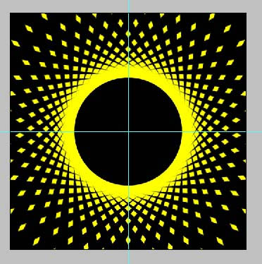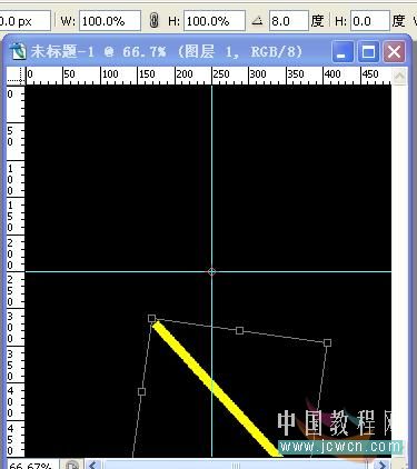 4、再次自由变换, 把图层1的中心点转移到参考线的中心交点上。如下图。并设置变换属性:角度为8度,按回车确定变形。