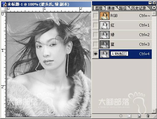 步骤三、复制G通道(绿色通道)为绿色通道副本,并改名为“人物选区”(双击通道名称部分即可更改)