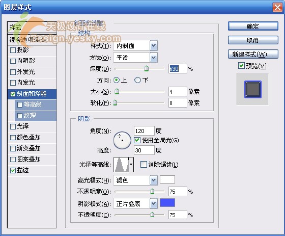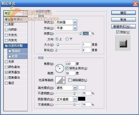 7.在图层调板中双击最上面图层名称右侧空白处(或选择“图层>图层样式>斜面和浮雕”),按图11所示设置“斜面和浮雕”样式。