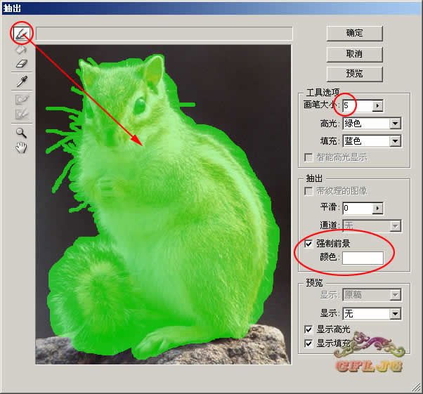 3、在图层1执行滤镜--抽出命令,在强制前景处打勾,颜色定为白色,用高光器工具涂抹绿色,中间大面积处可用大一点的笔触,主体外的胡须部分可用小一点的笔触,这里选择5。