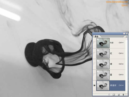 3、在通道调板中的绿色通道上,执行“全选”命令,在执行“拷贝”命令将在通道中显示回RGB通道。