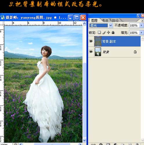 3、把背景副本图层混合模式改为“柔光”,效果如下图。