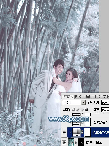 Photoshop打造梦幻淡调青蓝色的竹林婚纱照片调色教程