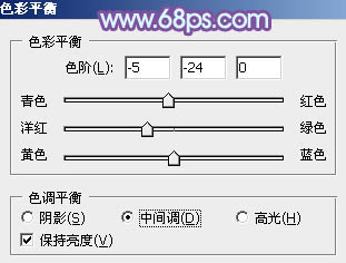 3、创建色彩平衡调整图层对阴影,中间调进行调整,参数设置如图8,9,效果如图10。这一步给图片增加蓝紫色。