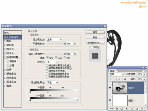 7、我们打开图层2的混合选项,在图层样式对话框中,调整“混合颜色带”