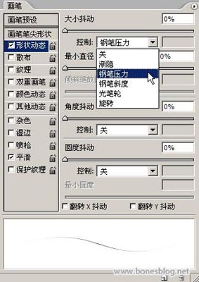 1、首先将画笔调整以下状态 ,这里说一下,钢笔压力这个选项只有装了手写板才会有的选项,我这里用的手写板是Wacom 影拓 II 。