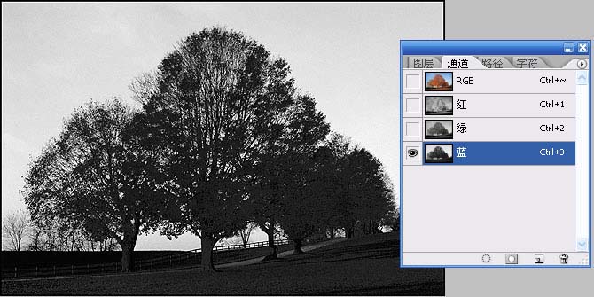 2、找到天空与其他反差最大的一个通道,发现是蓝色通道;