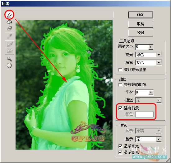 2、在图层1执行滤镜--抽出,在强制前景处打勾,颜色设定为白色,用边缘高光器工具按图示涂抹绿色,需要注意的是细心与否是成败的关键,在边缘的发丝处用小一点的笔触(这里选择了5)一根一根的涂抹(若看不清可用放大镜工具把图放大),中间的部分可用大一些的笔触涂抹,以节省时间。