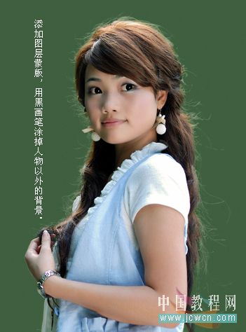 6、在图层1副本2添加图层蒙版,用黑画笔涂抹掉原图的背景,使之露出新的背景和抠出的发丝。