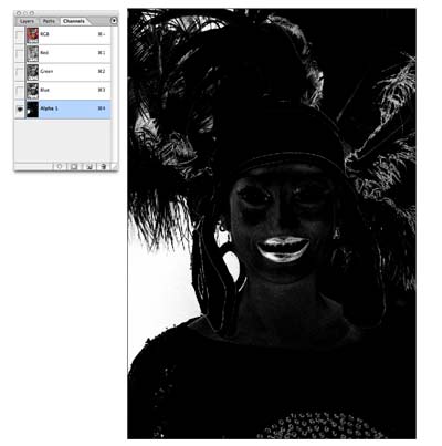 2 获得选区,在通道面板中,按下“将选区存储为通道”按钮,得到一alpha通道,取消选择(Ctrl+D),点击“Alpha 1”层,这时图像变成黑白色。提示:图像中的黑色区域是我们要保留的部分,白色为要扣除的部分。