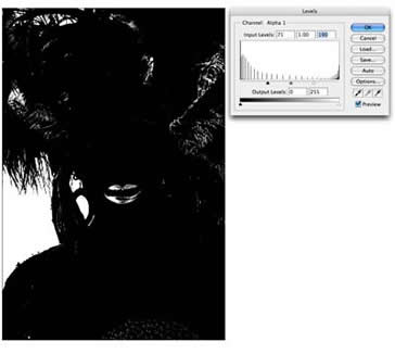 3 这时我们发现图像中还有部分灰色区域,这些将成为半透明区域,所以必须将他们调整为纯黑色或纯白色。图像 >> 调整 >> 色阶,打开色阶窗口,由左向右拖动黑色滑杆直到灰色区域变为纯黑色为止。由右向左移动白色滑杆将白色区域变得更清晰。