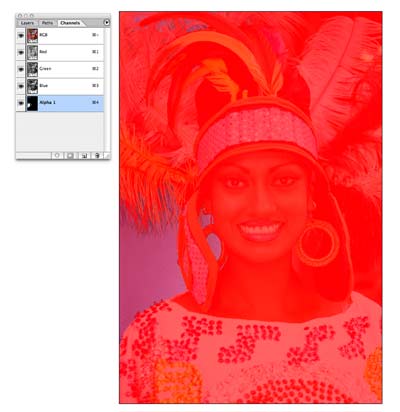 5 有时我们很难推测出什么地方需要保留什么地方需要扣去,这时点选RGB通道,原图像就显现出来,而蒙板区域有一层淡红色,继续清理蒙板范围。