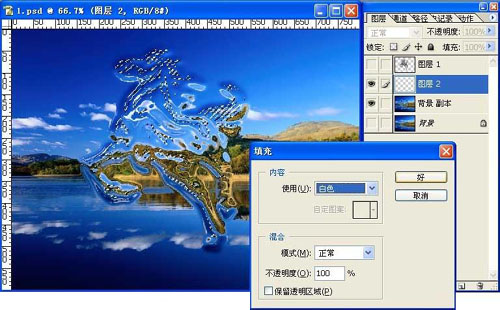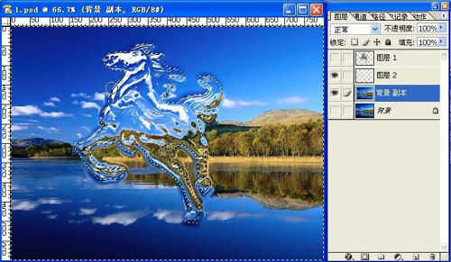 6、回到背景副本图层,按住CTRL键点击图层1获得马的轮廓选区,反选,用历史画笔沿着马的轮廓边缘擦涂,将刚才因玻璃滤镜扭曲过度的部分擦去。
