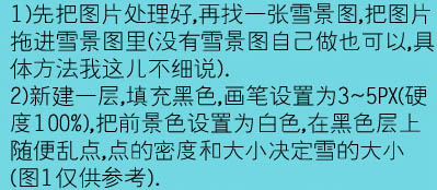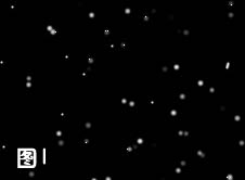 2、新建一个图层,填充黑色,选择画笔工具,大小设置为3-5个像素,硬度设为100%。把前景颜色设置为白色,在黑色层上随便乱点一些白点,点的密度和大小决定雪的大小,大致效果如图1。