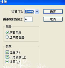c、再点帧面板层的第二帧,在帧面板上点击“过渡”按钮如图5,在“要添加的帧”里输入4,添加4帧,如图8,帧越多过渡越自然。