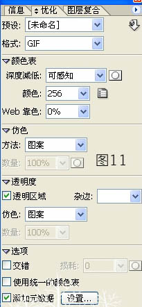 保存方法:选择菜单:文件 > 将优化结果存储为,把动画存为GIF格式的文件,优化栏的设置如图12。