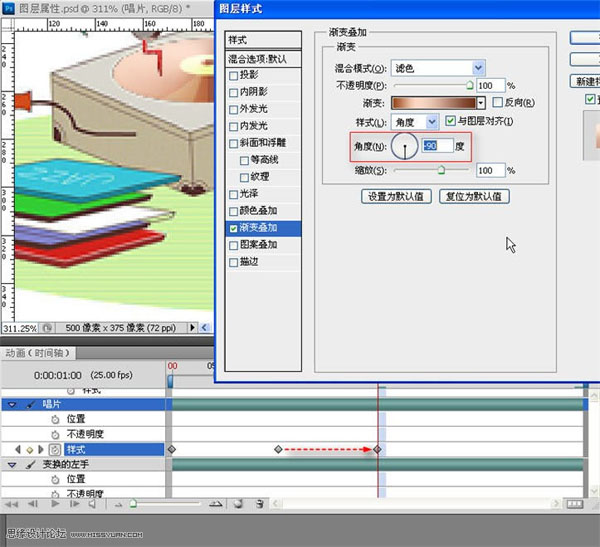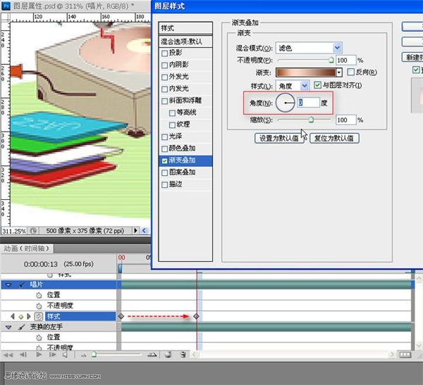 27、时间指示器移至时间轴的四分之一处,双击红框所示处的“渐变叠加”>“角度”旋转至0度,确定。