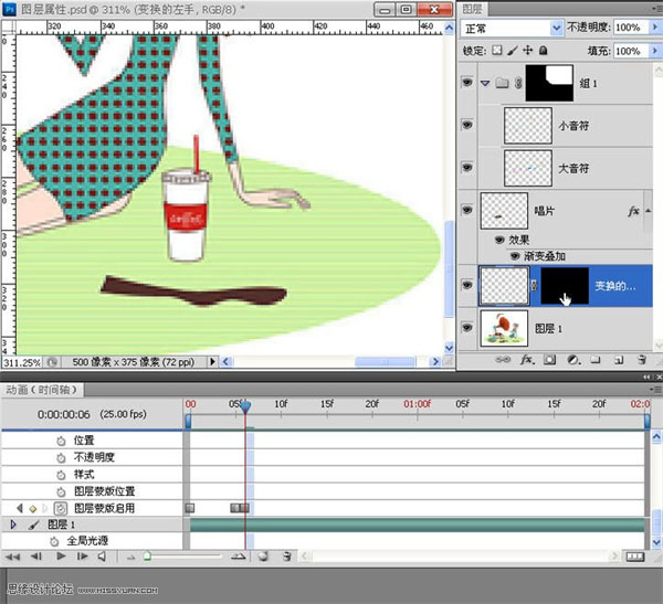 30、最后一个动作。为了尽可能多的加入动态元素,我觉着让人物的手跟着音乐一起动起来应该是即能达到好的效果又是最简单的方法,所以,我们复制并将人物的手做了相应的变化。