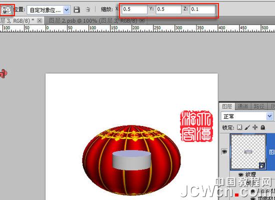 13、取3D对像平移工具(那个空心的十字)将它移动到灯笼上部,窗口/3D关闭顶部的小眼睛。如图(为了准确移动到位,可在编辑/首选项/3D中去掉“自动隐藏图层”前的勾)。